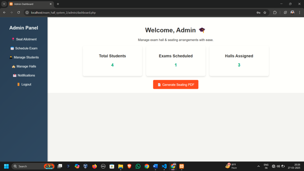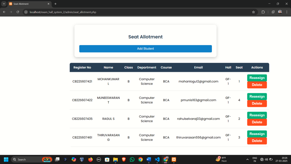 A fully functional web application designed to simplify exam hall management and student seating allocation. Ideal for final year projects, college automation systems, or web development learning. Includes an Admin Panel, Student Portal, and Email Notification Integration.