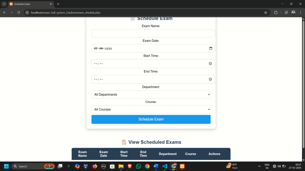 A complete Exam Hall Management System using PHP & MySQL – with student login, admin panel, seat allocation, and email notifications. 📦 You'll get... Full Source Code (ZIP) SQL Database File Setup Guide (README) Email Notification Integration Admin Dashboard + Student Portal Sample Screenshots